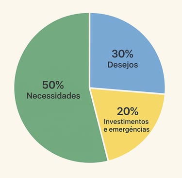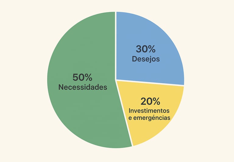 CategoriaPercentualDescrição50% - Necessidades50% da rendaAluguel, alimentação, transporte30% - Desejos30% da rendaLazer, roupas, assinaturas20% - Investimentos e emergências20% da rendaPoupança, Tesouro Direto, reserva de emergência