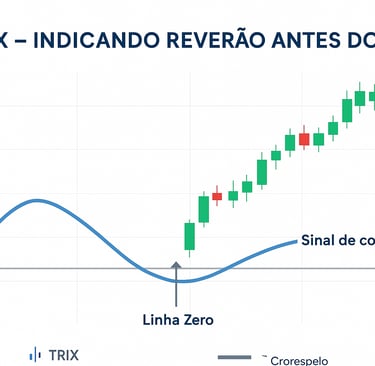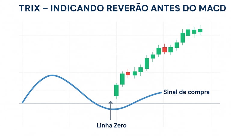 📊 Gráfico ilustrativo: TRIX acompanhando o preço com a linha zero destacada e as zonas de reversão.