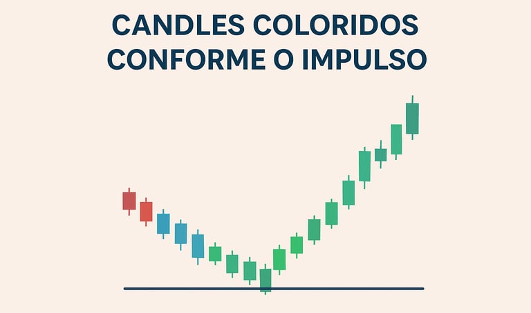 📊 Gráfico ilustrativo: candles coloridos conforme o impulso, com destaque para a transição azul-verde nos momentos de reversão.